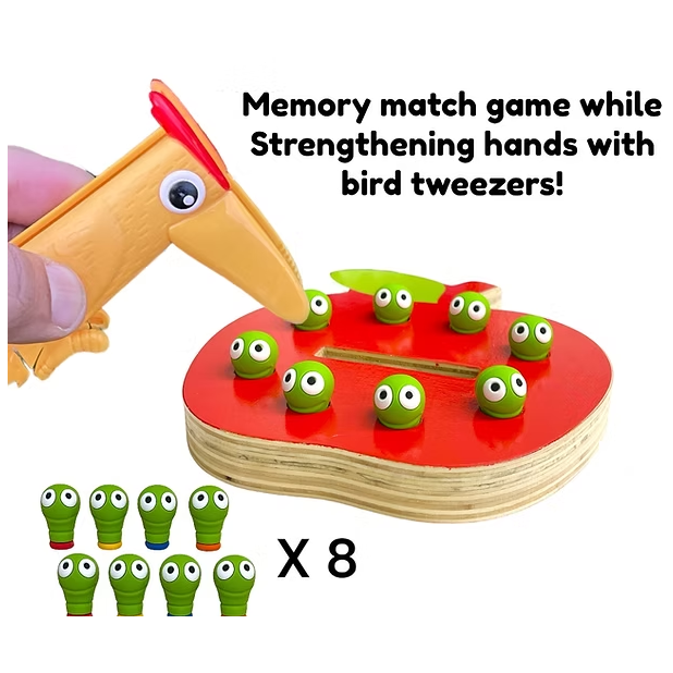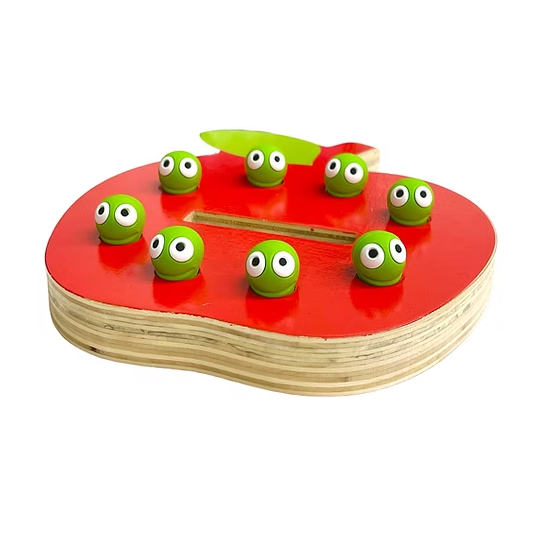 boom met bodem, 3 bakjes, vogeltang, 2 appelschaar, 18 appels, 8 wormpjes, engels talige instructie