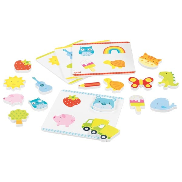 16 houten kaarten, 4 opdrachtskaarten, 1 voelzak in bonbon vorm